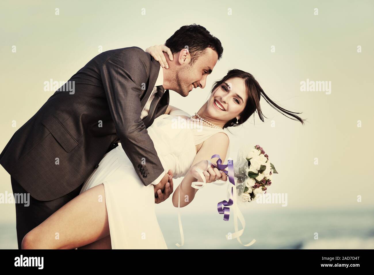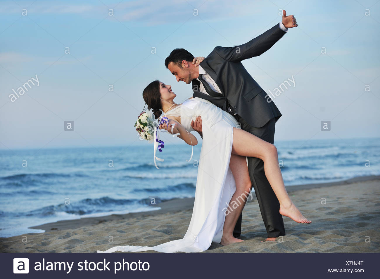 Bride And Groom Married Couple Sunset Beach Wedding Stock Photo