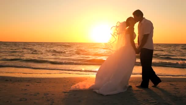 Bride And Groom Married Couple Kissing Sunset Beach Wedding Stock