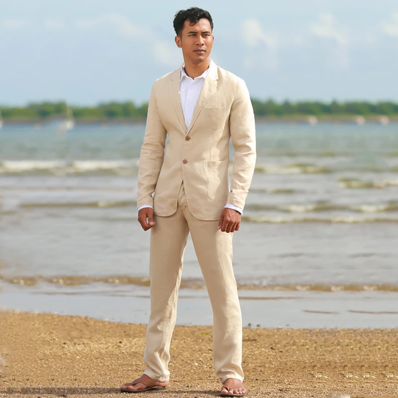 Weve already rounded up for you some breathtaking beach wedding gowns and now its time to think how to dress your groom. Pure linen attire including pants shirts vests jackets and three piece suits for grooms and groomsmen complete outfits specifically tailored for summer destinations and beach weddings. Both formal casual styles.