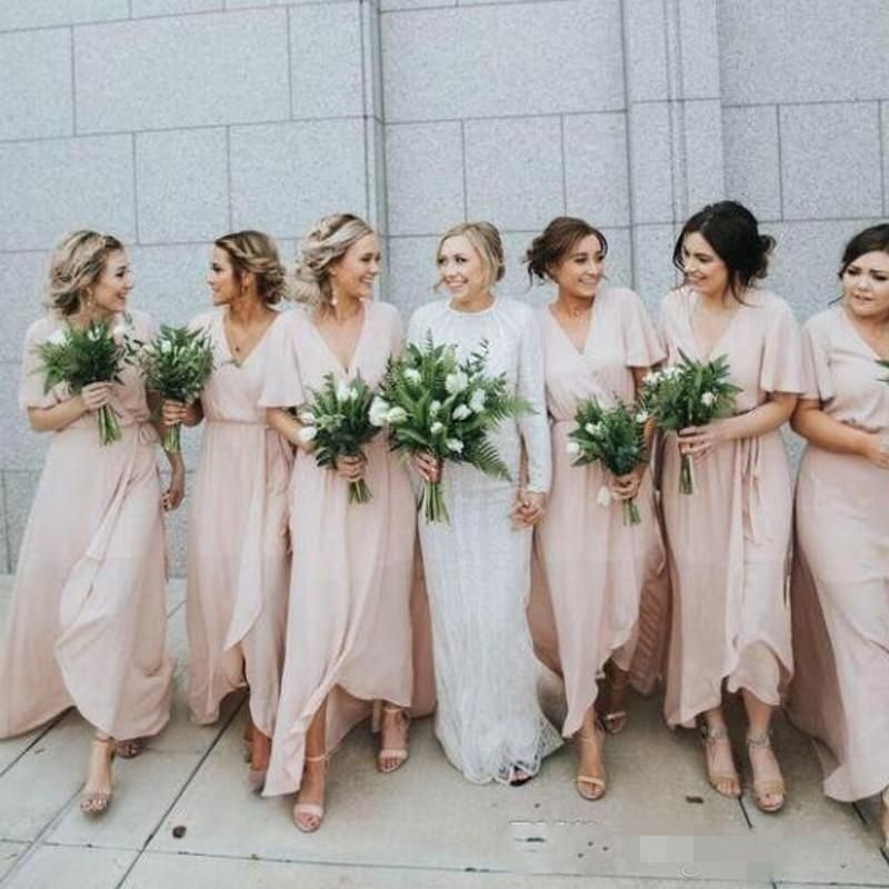 2019 Blush Boho Bridesmaid Dresses Short Sleeves Elegant V Neck