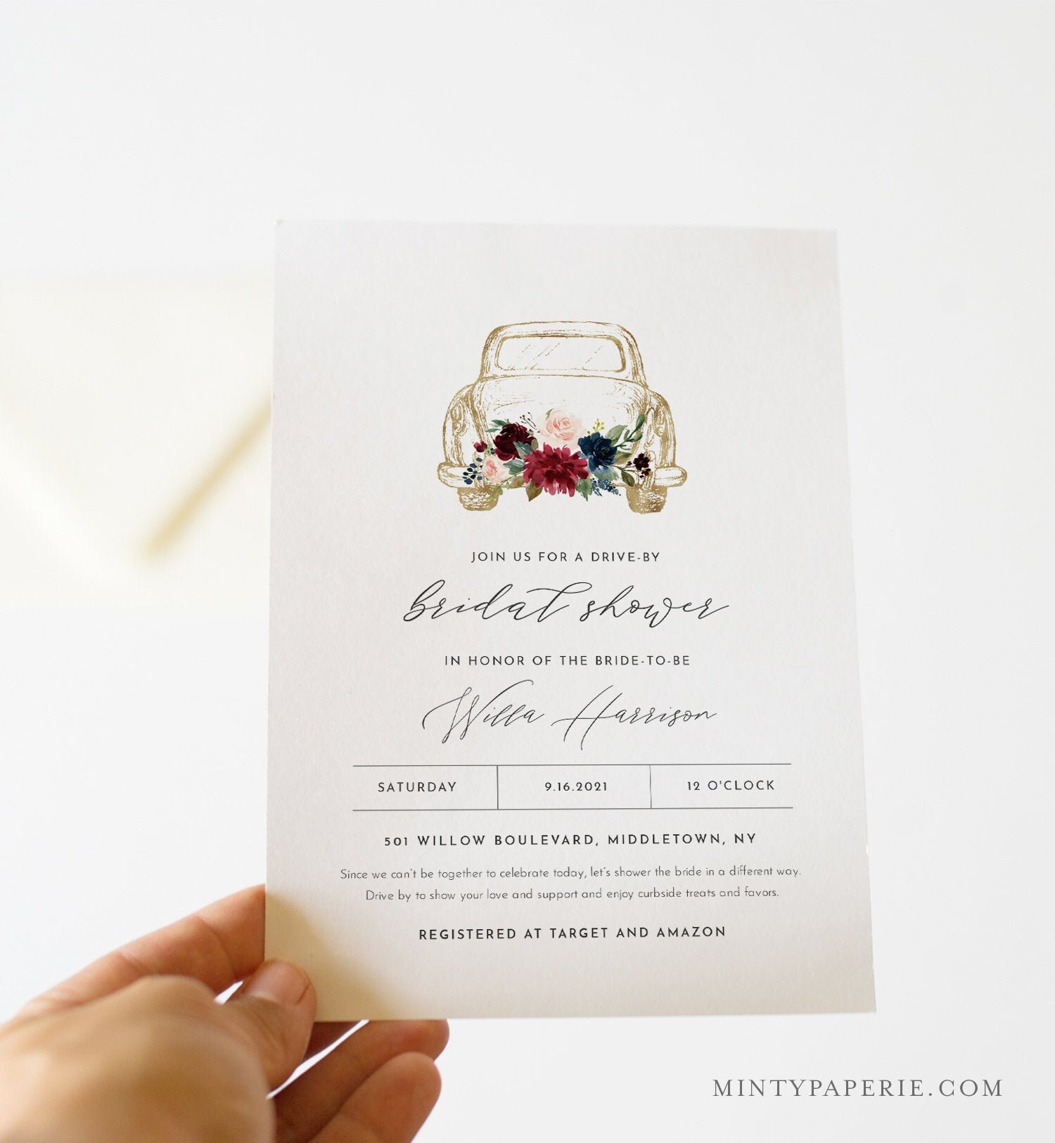 Bride drive by wedding shower invitations. First how to decorated for a drive by bridal shower and second how to sort out the logistics and plan. Navy red blush rose floral drive by couples shower postinvitations. Mar 31 2020 explore invited by casss board drive by shower invitations followed by 511 people on pinterest.This post is separated into two helpful sections. A drive by bridal shower or drive through is an event that allows social distancing for the guests while they shower the bride to be with love and happiness and gifts. For decor weve created three fun and shoppable starter packs for a boho modern or romantic theme.