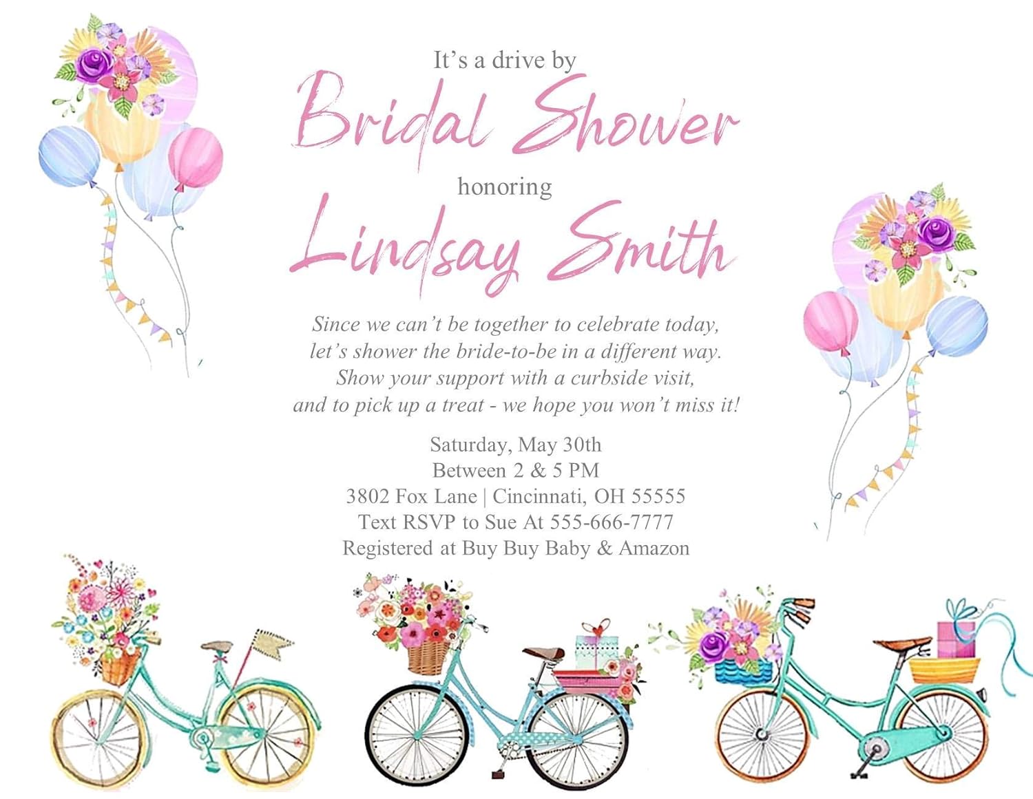 Amazon Com Drive By Bridal Wedding Shower Invitation Bicycles Balloons Handmade